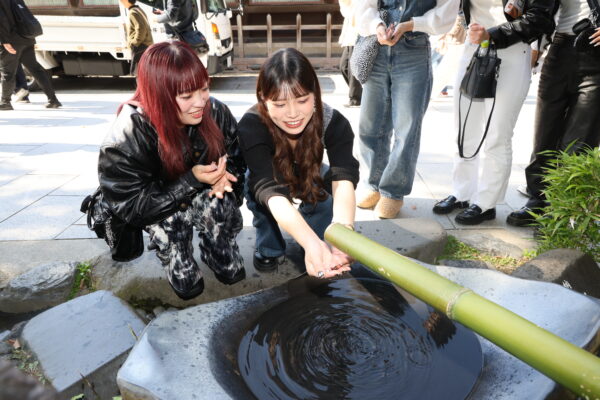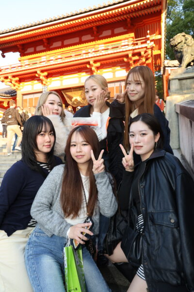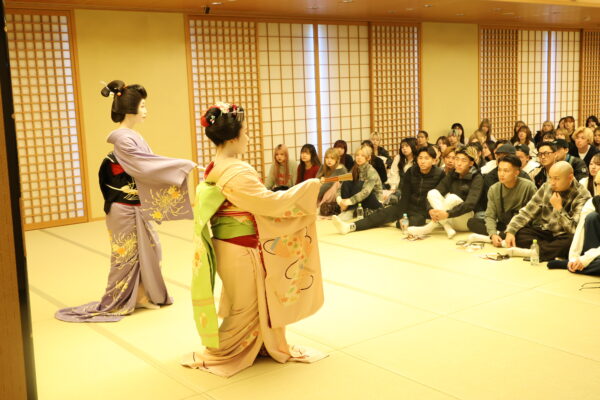 知恩院の前で集合写真を撮った後、文化研修では京都で実際に活躍されている舞妓・芸妓さんと交流し、その技術と話術をしっかりと目に焼き付けました。